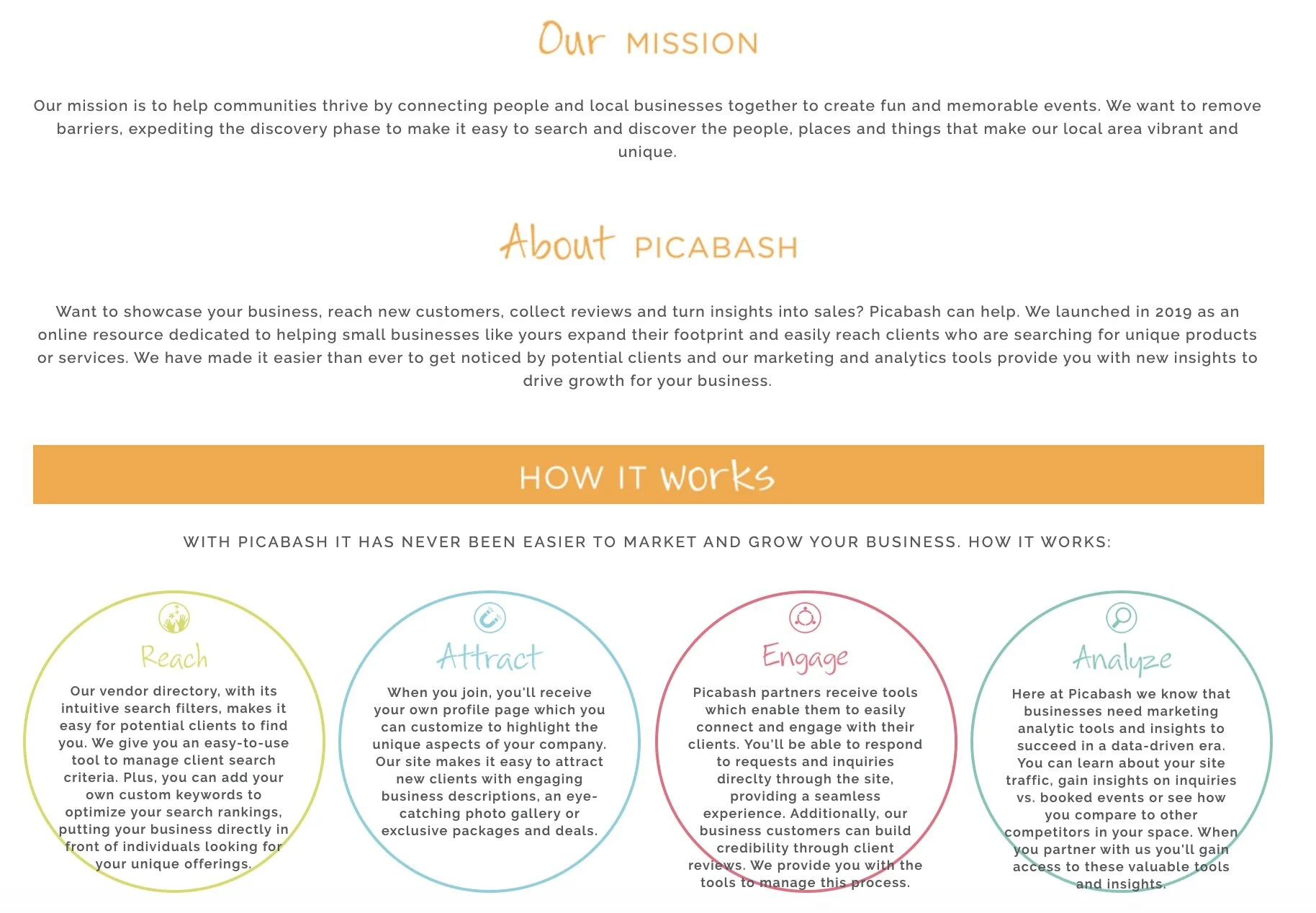 The founder of Picabash was a busy working mom looking to plan her child's birthday party. She struggled to hire local businesses owned by Women and People of color. Picabash was created because the founder understood the need to promote these underrepresented communities and she made it her goal to find a way to do this. The website needed to be a one-stop-shop for consumers looking to plan their party while also giving vendors a platform to promote their businesses.
