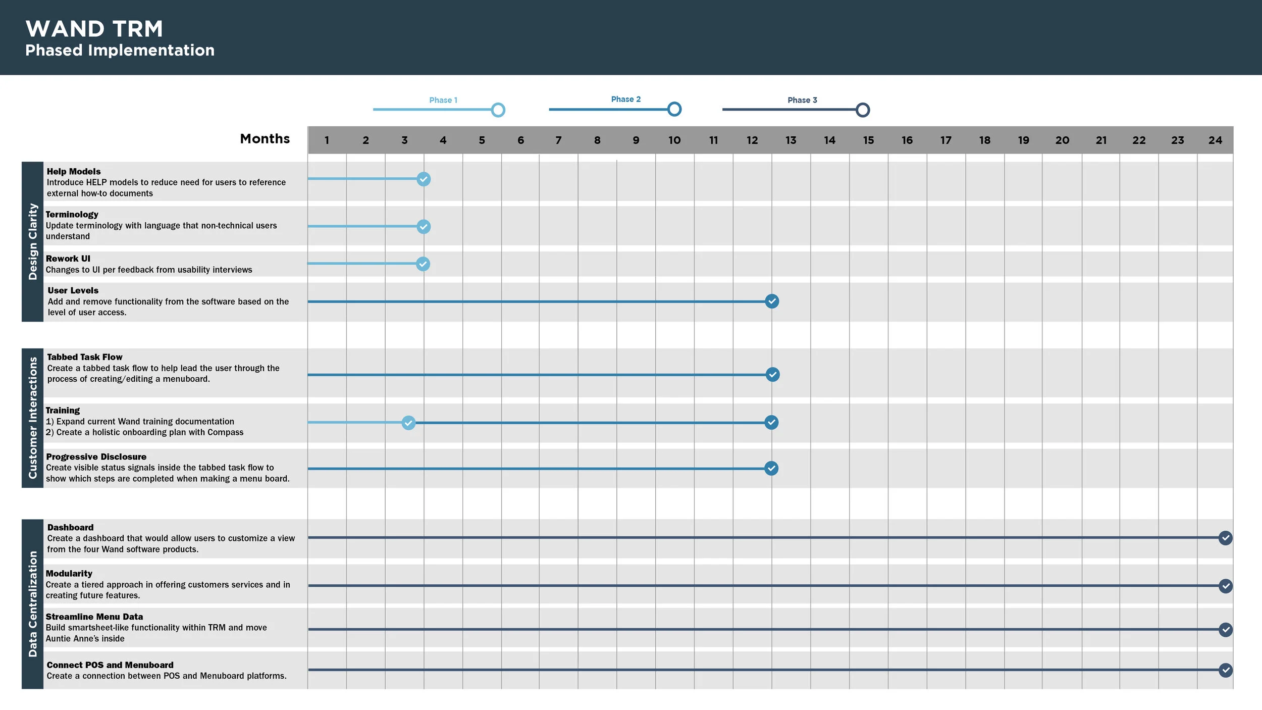 We delivered a roadmap in which we proposed a phased approach to making the WAND software easier to use for both current and future clients. Our recommendations include adding clarity to their visual design, simplifying their customer interactions, and offering data integration to their customers.